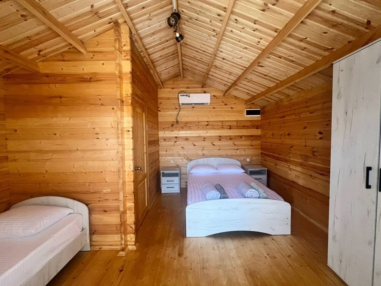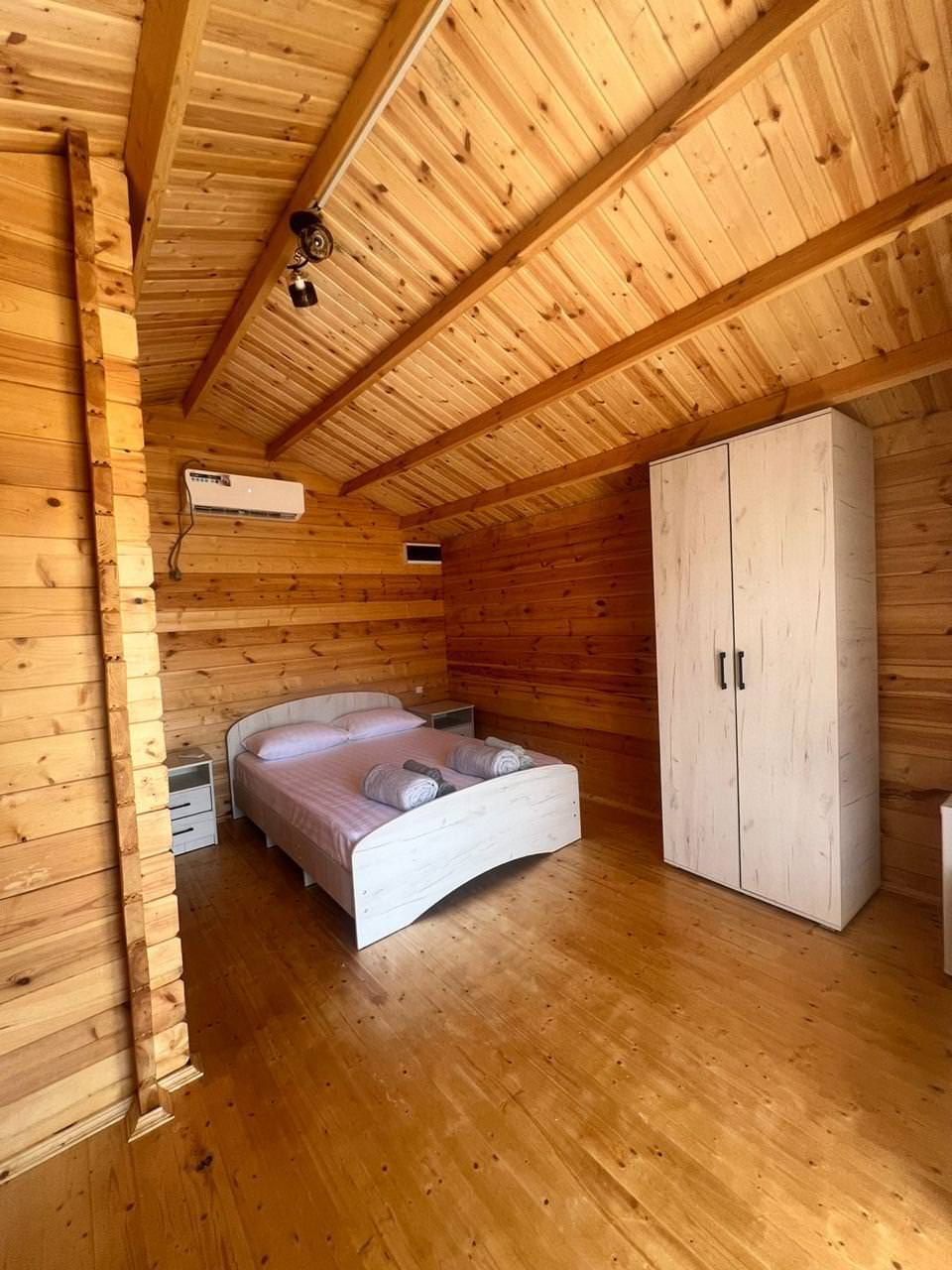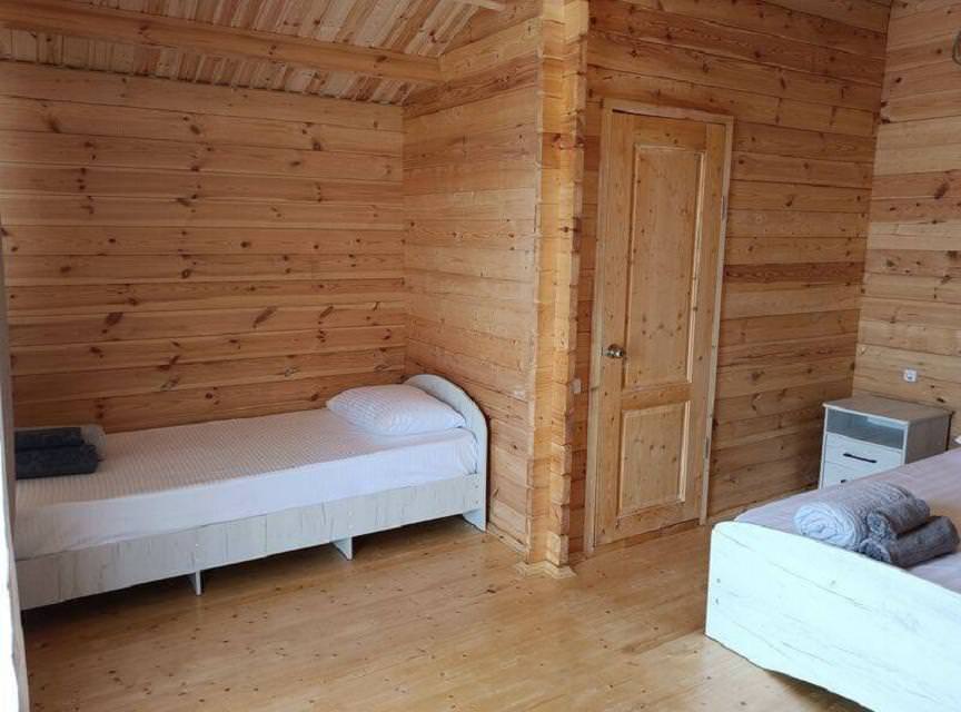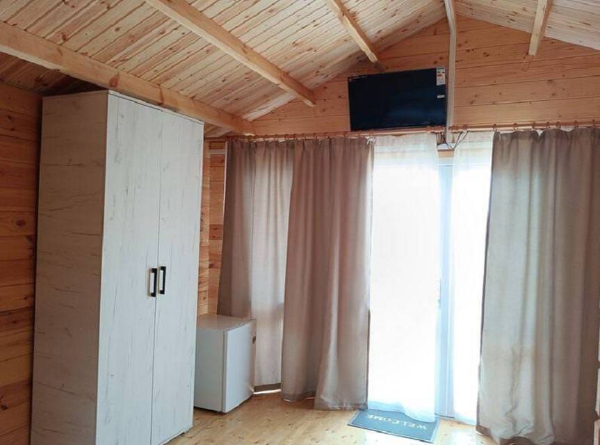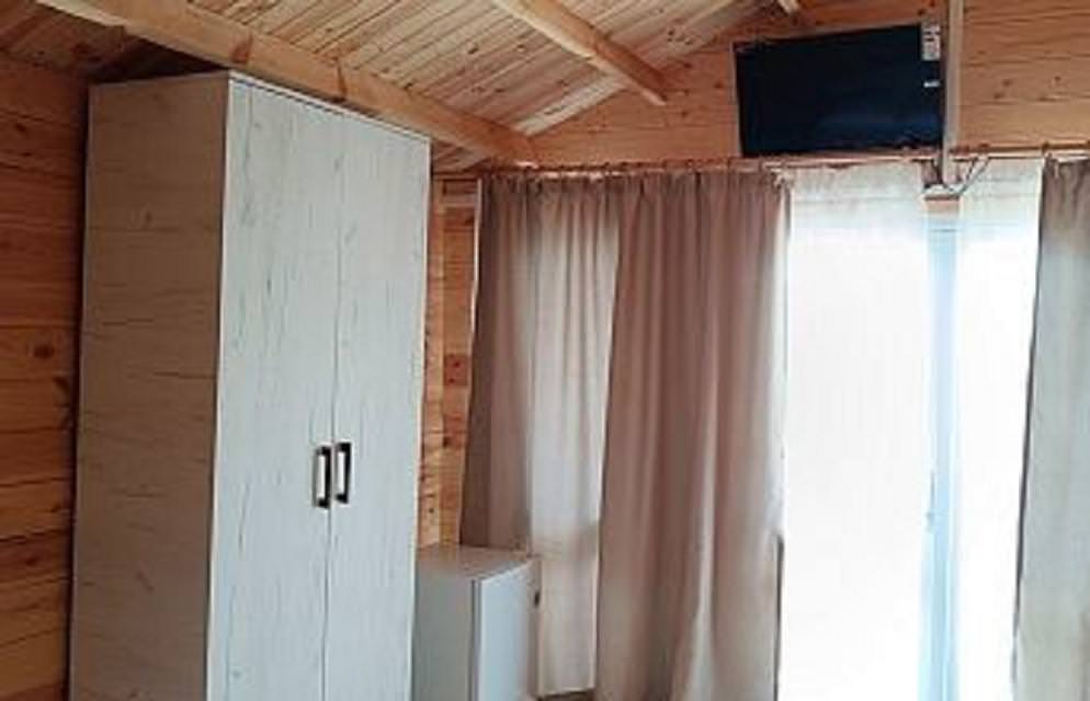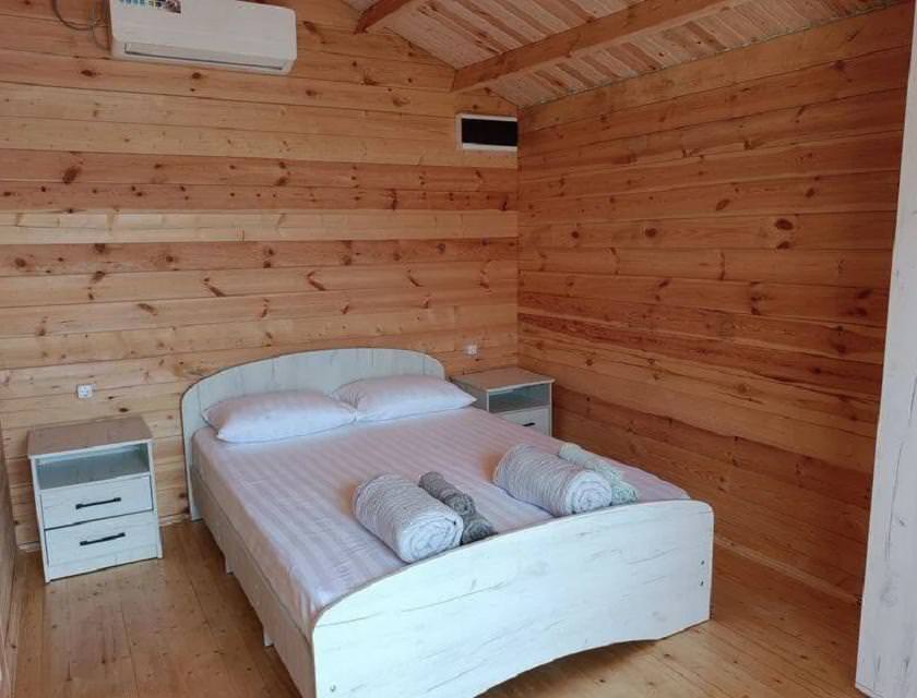 В коттедже три спальных места, кондиционер, телевизор, Wi-Fi, холодильник, шкаф для одежды и зеркало, собственная ванная комната, на террасе у каждого коттеджа столик со стульями для отдыха.